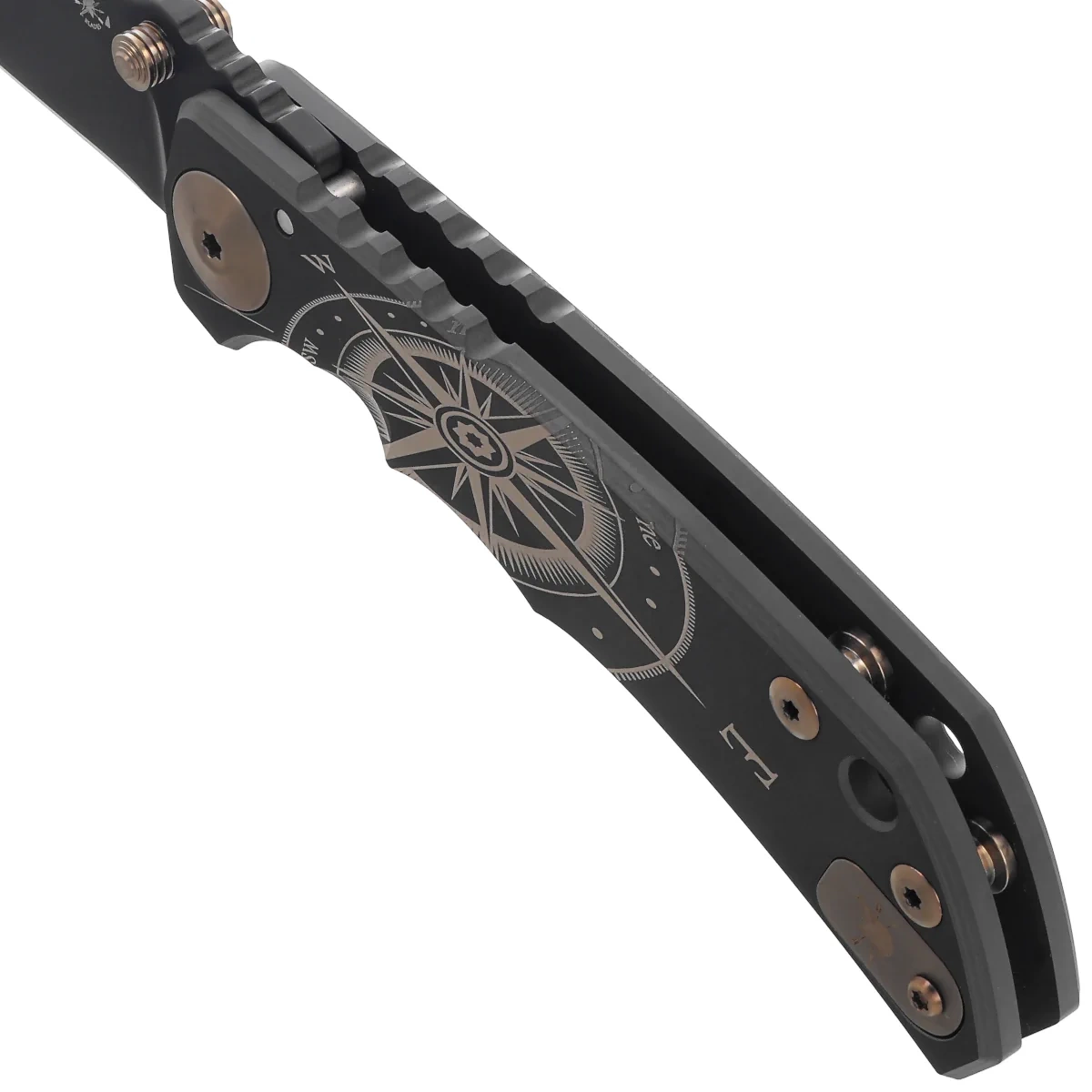Solidna rękojeść z tytanu ozdobiona jest artystycznym grawerunkiem, przedstawiającym motyw kompasu z Różą Wiatrów. Całość uzupełniają anodowane na brąz detale, które efektownie kontrastują z czarnym kolorem rękojeści. Dzięki odpowiednio wyprofilowanemu uchwytowi nóż pewnie leży w dłoni, zapewniając precyzję podczas wykonywania różnorodnych działań. Solidny mechanizm blokujący typu frame lock gwarantuje bezpieczne użytkowanie nawet w ekstremalnych warunkach. Każdy egzemplarz jest wykonywany ręcznie w USA, co czyni go wartościowym i poszukiwanym przedmiotem zarówno wśród kolekcjonerów, jak i wymagających użytkowników.