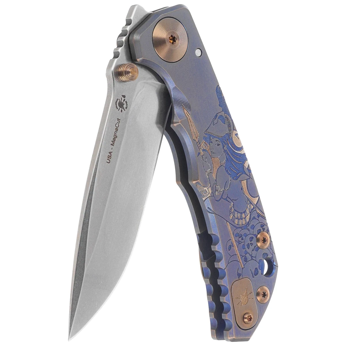 Solidna rękojeść z tytanu ozdobiona jest artystycznym grawerunkiem, przedstawiającym motyw młodej dziewczyny. Całość uzupełniają anodowane na brąz detale, które efektownie kontrastują z niebieskim odcieniem rękojeści. Dzięki odpowiednio wyprofilowanemu uchwytowi nóż pewnie leży w dłoni, zapewniając precyzję podczas wykonywania różnorodnych działań. Solidny mechanizm blokujący typu frame lock gwarantuje bezpieczne użytkowanie nawet w ekstremalnych warunkach. Każdy egzemplarz jest wykonywany ręcznie w USA, co czyni go wartościowym i poszukiwanym przedmiotem zarówno wśród kolekcjonerów, jak i wymagających użytkowników.