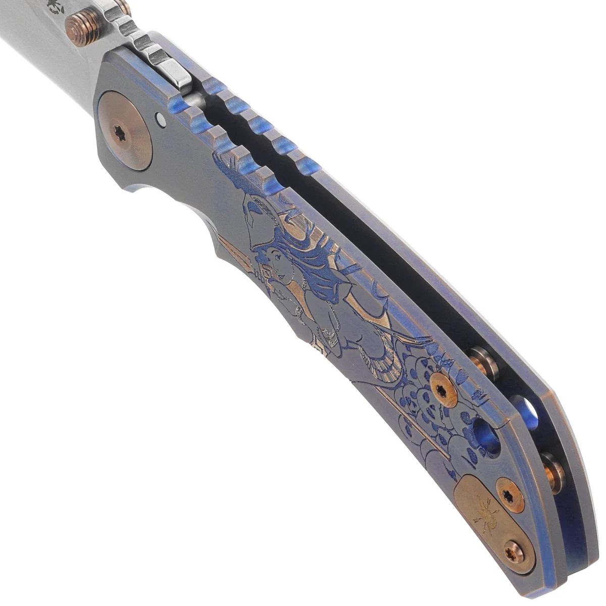Solidna rękojeść z tytanu ozdobiona jest artystycznym grawerunkiem, przedstawiającym motyw młodej dziewczyny. Całość uzupełniają anodowane na brąz detale, które efektownie kontrastują z niebieskim odcieniem rękojeści. Dzięki odpowiednio wyprofilowanemu uchwytowi nóż pewnie leży w dłoni, zapewniając precyzję podczas wykonywania różnorodnych działań. Solidny mechanizm blokujący typu frame lock gwarantuje bezpieczne użytkowanie nawet w ekstremalnych warunkach. Każdy egzemplarz jest wykonywany ręcznie w USA, co czyni go wartościowym i poszukiwanym przedmiotem zarówno wśród kolekcjonerów, jak i wymagających użytkowników.