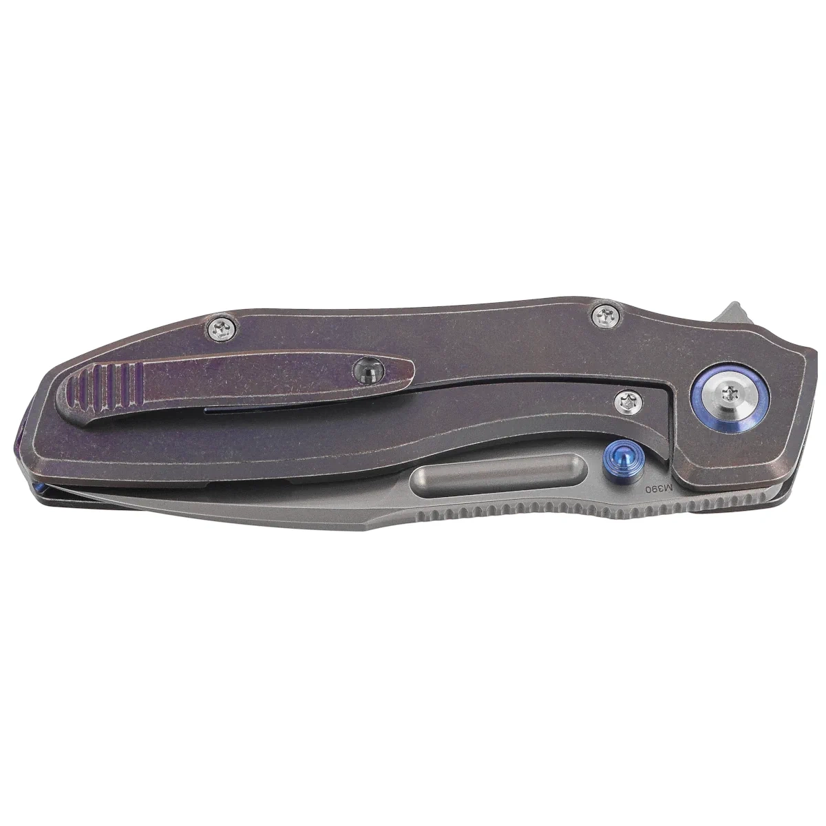 Rękojeść - z tytanu 6AL4V została precyzyjnie obrobiona metodą CNC i wykończona techniką Stonewashed, a następnie ręcznie kolorowana palnikiem. Trójwymiarowe przetłoczenia i profilowanie poprawiają komfort pracy w każdym rodzaju chwytu. Wnętrze wzmacnia pełny backspacer, zapewniający integralność strukturalną. Zastosowana blokada frame lock została wyposażona w stalową wkładkę oraz mechanizm overtravel stop, chroniący przed nadmiernym odchyleniem ramienia. Klips typu deep carry i ukryty otwór na linkę zwiększają funkcjonalność podczas codziennego noszenia. Całość dopełnia innowacyjny system removable/reversible flipper tab, umożliwiający konfigurację otwierania zgodnie z preferencjami użytkownika.