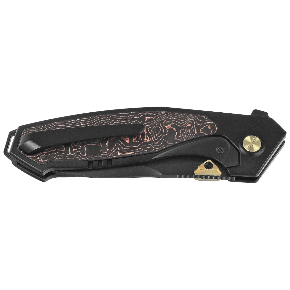 Rękojeść - z frezowanego tytanu 6AL4V, stanowi solidną podstawę dla smukłej i trwałej konstrukcji. Wstawki z kompozytu Copper Carbon Fiber poprawiają chwyt oraz podkreślają nowoczesny charakter projektu. Rękojeść została wyprofilowana tak, aby zapewnić komfort i kontrolę nawet przy dłuższej pracy – ergonomiczne przetłoczenia naturalnie dopasowują się do dłoni. Całość uzupełniają zintegrowany backspacer który po demontażu może służyć do odkręcenia śruby pivota, oraz klips typu deep carry, który umożliwia niskoprofilowe i bezpieczne noszenie. Projekt rękojeści stanowi przemyślaną równowagę między estetyką a praktycznością, odpowiadając na potrzeby doświadczonych użytkowników EDC.