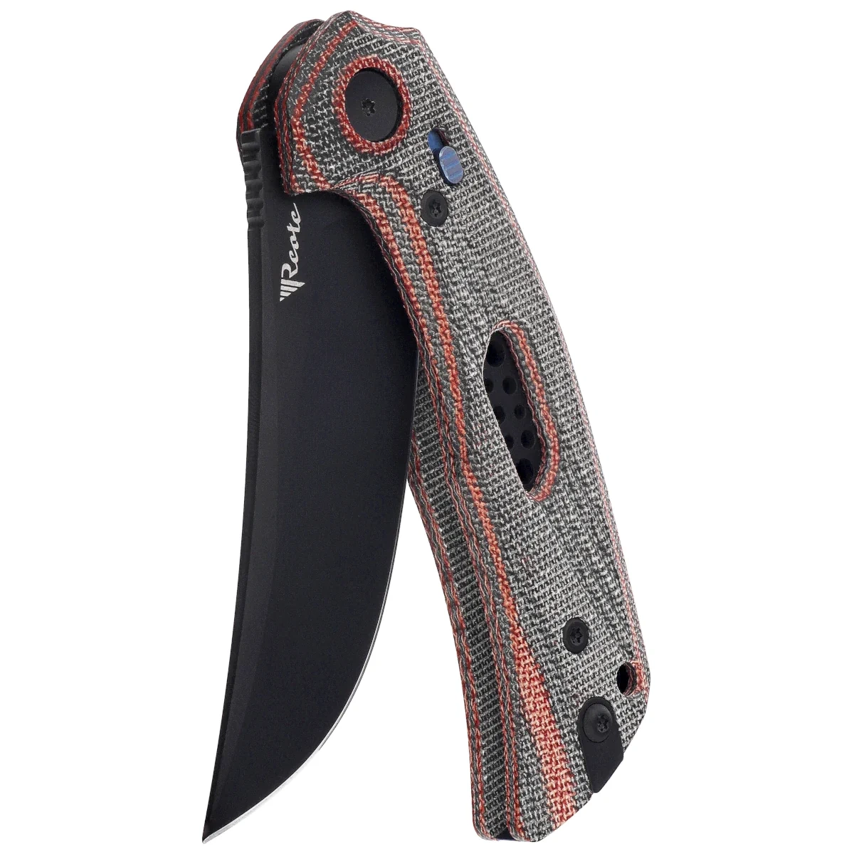 Rękojeść - z dwukolorowej Micarty, materiału odpornego na wilgoć i zmiany temperatur, o strukturze laminowanej, która zwiększa trwałość przy zachowaniu niskiej wagi. Frezowane wykończenie zapewnia pewny chwyt bez nadmiernej szorstkości. Mechanizm pivot lock, osadzony centralnie, pozwala na intuicyjne blokowanie i zwalnianie ostrza poprzez naciśnięcie śruby osi. Lekko powiększony profil poprawia ergonomię, szczególnie przy dłuższych zadaniach. Całość uzupełniono o obustronny klips deep carry z tytanu, umożliwiający dyskretne przenoszenie oraz otwór na smycz, który zwiększa możliwości mocowania i zabezpieczenia. Dokładność spasowania oraz wykończenie wszystkich elementów potwierdzają jakość klasy premium, z której znana jest marka Reate.