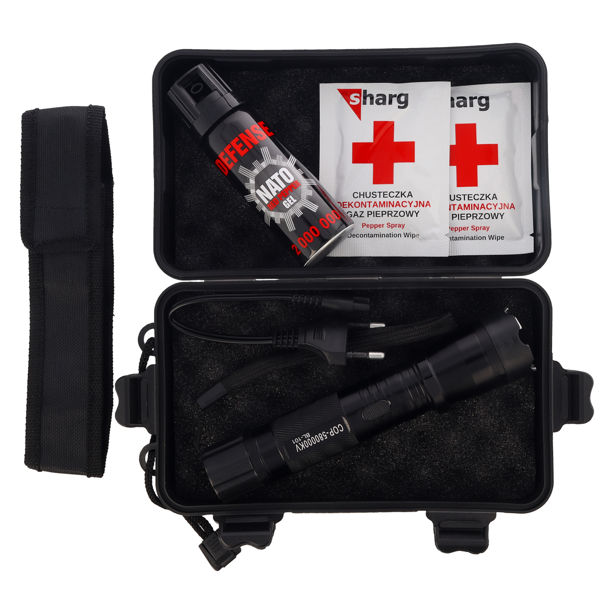 Zestaw obronny 4w1 Gaz pieprzowy Sharg Nato Defence, Dwie chusteczki, Paralizator, Skrzynka Survivalowa