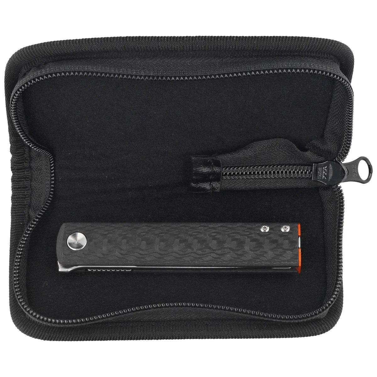 Rękojeść - z kompozytu 3K Carbon Fiber, materiału zapewniającego wysoką wytrzymałość i wyjątkową lekkość. Jej powierzchnia została delikatnie teksturowana w celu poprawy chwytu, a ergonomiczne profilowanie zwiększa komfort trzymania nawet podczas dłuższej pracy. Anodowany backspacer w kolorze pomarańczowym usztywnia konstrukcję i wprowadza dynamiczny akcent stylistyczny. Użytkownik ma do dyspozycji dwustronny klips typu deep carry umożliwiający dyskretne noszenie oraz blokadę liner lock, która gwarantuje bezpieczeństwo podczas użytkowania. W zestawie elegancki pouch z wysokojakościowej skóry do przechowywania i przenoszenia noża.