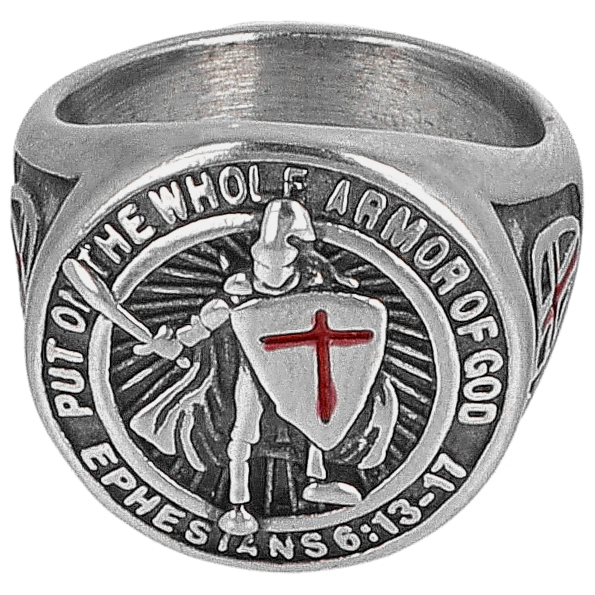 - Pierścień Tole 10 Imperial Templar Ø21 (16250-21) — masywny sygnet templariusza z czerwonym krzyżem i cytatem o „zbroi Bożej”. Emaliowane detale, stalowa powierzchnia, średniowieczna symbolika.