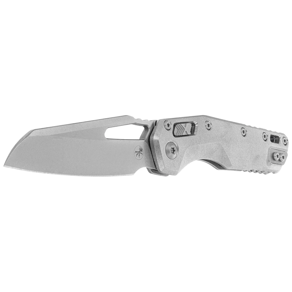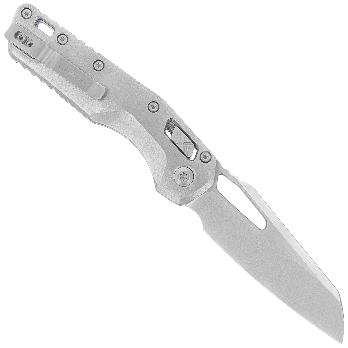 Rękojeść - wykonana z doskonałą precyzją w technologii 3D na frezarkach CNC z wytrzymałego tytanu, dla lepszego uchwytu również wykończona metodą Stonewashed. Szeroki suwak blokady z charakterystyczną dla firmy Microtech schodkową strukturą X. Obie okładziny zostały skręcone przy pomocy solidnego, tytanowego backspacera. Dwustronny (prawa / lewa) klips pozwala dyskretnie nosić nóż w pozycji tip-up. Nad klipsem lanyard hole, miejsce na linkę zabezpieczającą lub ozdobną.