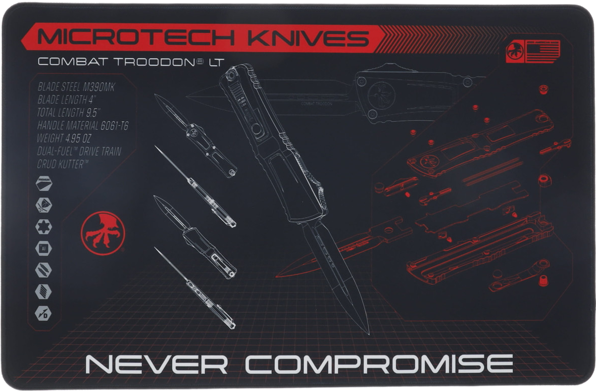 W centrum kompozycji znajduje się schemat konstrukcyjny modelu Combat Troodon, jednego z najbardziej rozpoznawalnych noży OTF w ofercie Microtech. Szczegółowa ilustracja typu CAD prezentuje eksplodowany widok głównych komponentów, co czyni matę nie tylko efektowną wizualnie, ale również edukacyjną i praktyczną dla entuzjastów technicznych aspektów budowy noży.