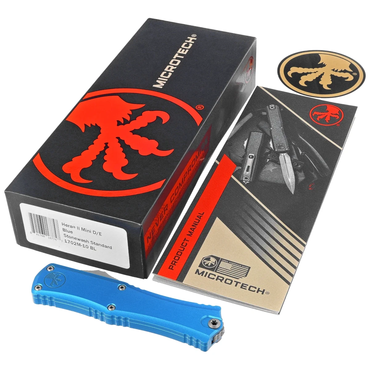 - Hera II Mini D/E Blue Aluminium, Stonewashed kompaktowa wersja jednego z najlepszych noży automatycznych OTF. Wygodny do przenoszenia, przy zachowaniu mocy większych modeli. Projekt Anthony'ego Marfione właściciela Microtech Knives.
