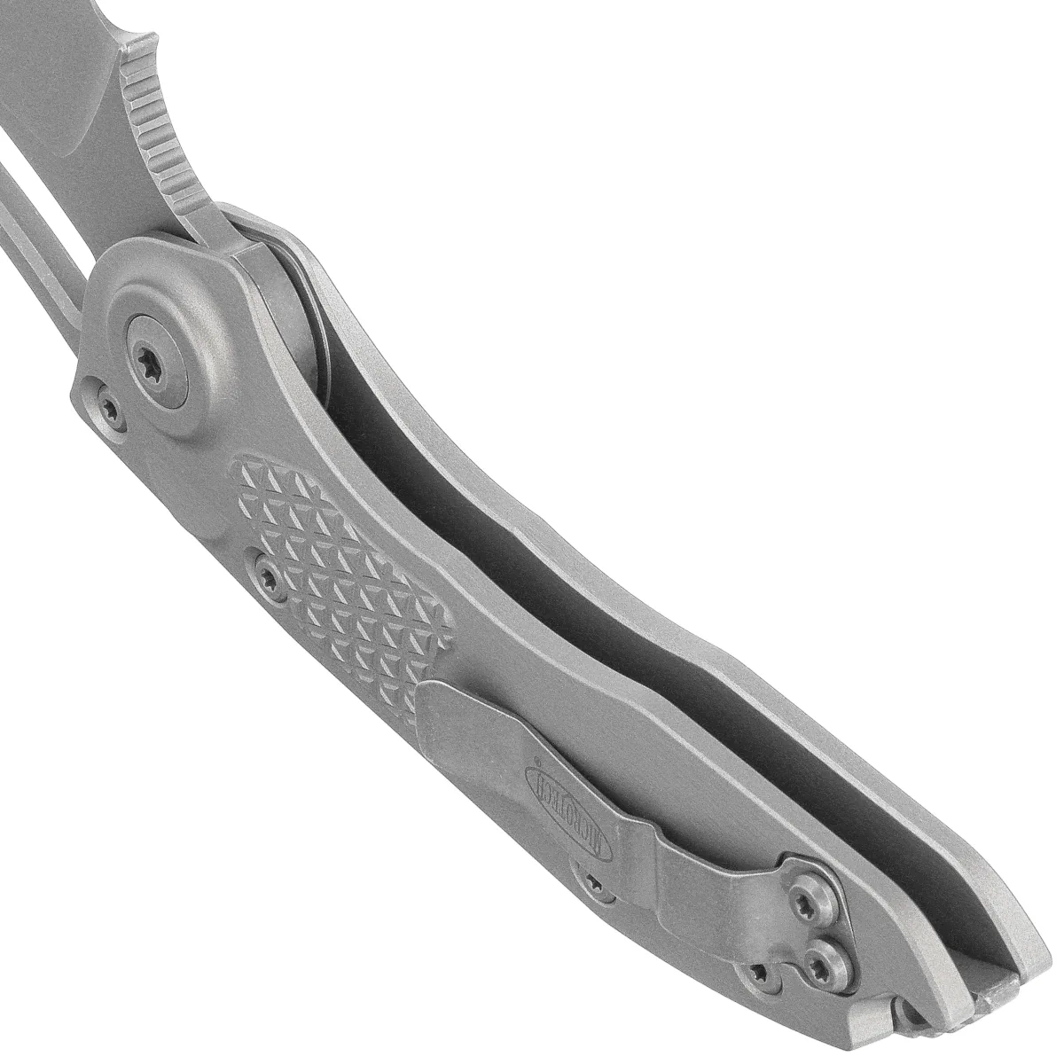 Rękojeść - wykonana na frezarkach CNC z doskonałą precyzją, z 6061-T6 Aluminium o głęboko frezowanej strukturze Tri-Grip. Szeroki przycisk otwierający nóż został umieszczony w zagłębieniu, co chroni przed przypadkowym otwarciem. Obie okładziny zostały skręcone przy pomocy solidnego, aluminiowego backspacera. Dwustronny (prawa / lewa) klips pozwala dyskretnie nosić nóż w pozycji tip-up. Wystający fragment backspacera w którym znajduje się otwór na linkę, może również służyć za improwizowany zbijak do szkła.