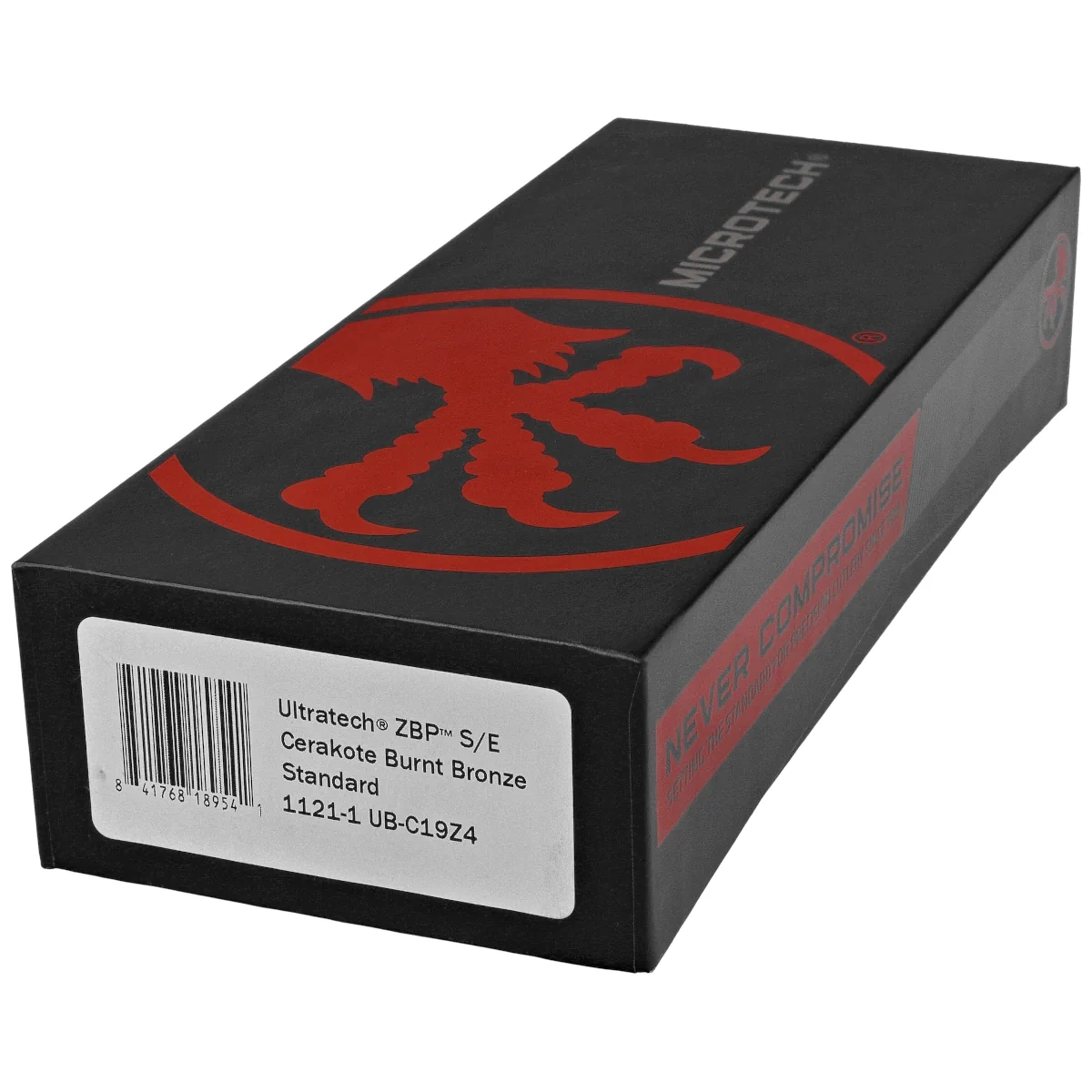 Ultratech S/E Gen III ZBP Cerakote Burnt Bronze Aluminium, Cerakote Burnt Bronze to nowa odsłona serii Ultratech - pierwszy nóż OTF firmy Microtech bez jakiegokolwiek luzu ostrza po jego rozłożeniu! Automat z ostrzem "blade play free" wyróżnia się szeregiem usprawnień, takich jak; Crud Kutter™, Dual-Fuel Drive Train™, Zero Blade Play™. Przeprojektowano również rękojeść, wyposażając ją w rozwiązania znane z innych modeli. Pracujący w trybie D/A (Double Action), umożliwia błyskawiczne wysunięcie i schowanie ostrza za pomocą jednego ruchu kciuka. Projekt autorstwa Tony’ego Marfione, właściciela Microtech Knives, łączy w sobie nowoczesny design z najwyższą jakością wykonania