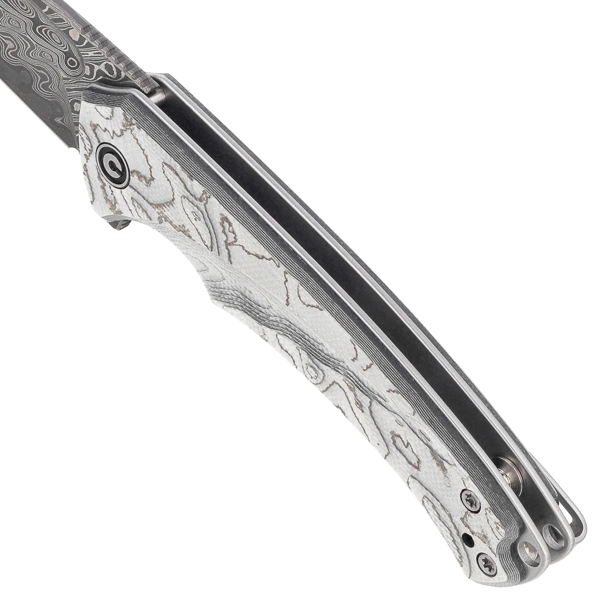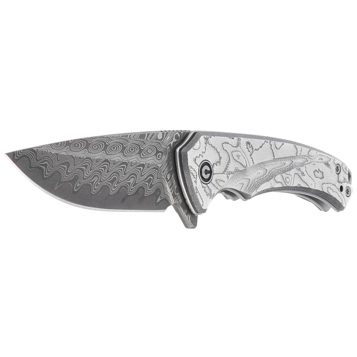 Głownia - typu drop point została wykonana z wytrzymałego nierdzewnego damastu, oferującego dobrą retencję ostrości, odporność na rdzę oraz łatwość ostrzenia. Szlif wklęsły zapewnia precyzyjne prowadzenie ostrza, a trawienie acid etched podkreśla linię wzorów stali. Otwieranie odbywa się za pomocą flippera, który w połączeniu z łożyskami ceramicznymi gwarantuje aksamitnie płynny ruch ostrza – bez oporu, bez hałasu, z natychmiastową gotowością do działania.