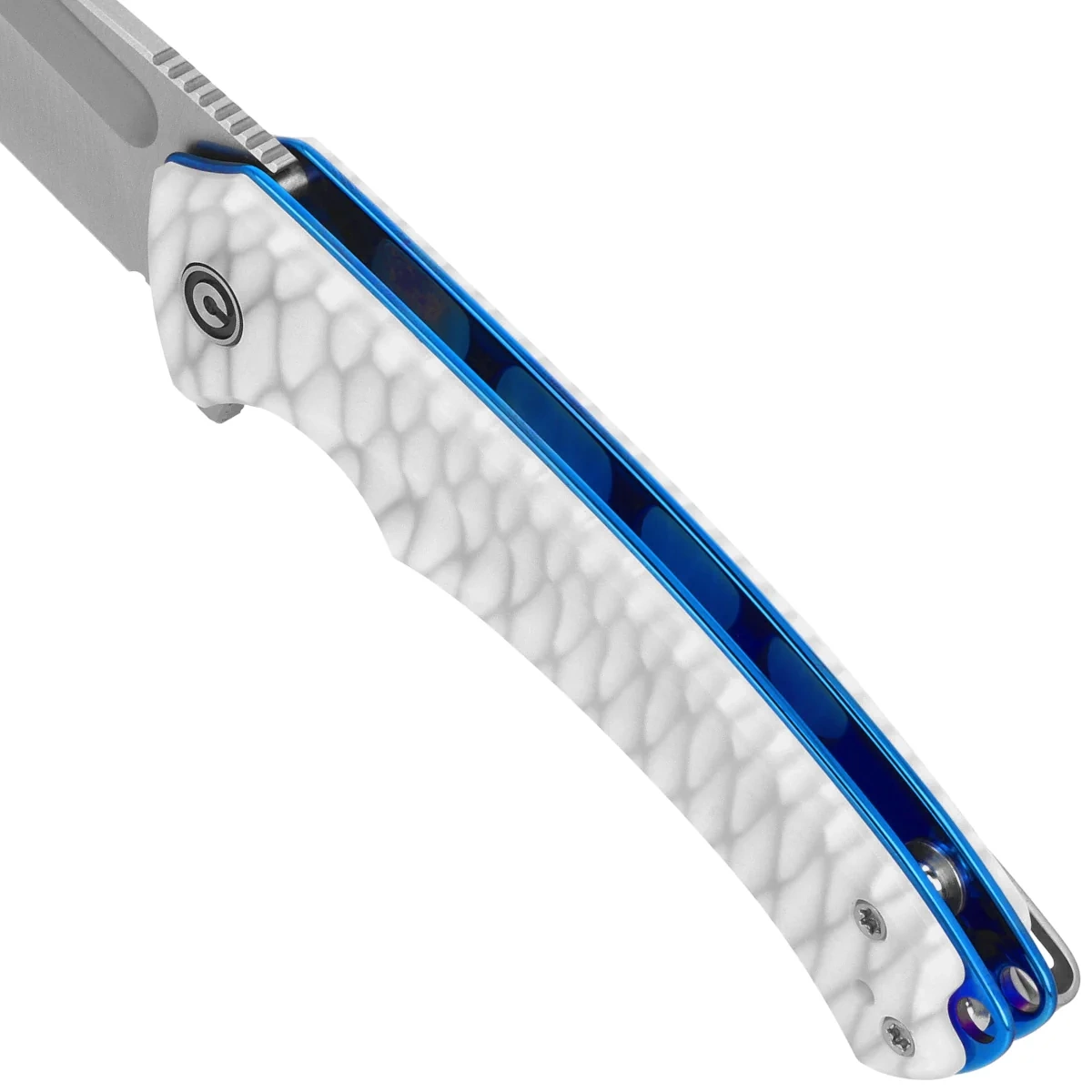 - Voidflare Greyish White Resin, Satin – elegancki nóż składany EDC z ostrą i wytrzymałą głownią ze stali 14C28N, osadzony na lekkiej i teksturowanej rękojeści z kompozytu żywicy. Wzór łuski na rękojeści i dynamiczna linia podkreślają nowoczesny styl.
