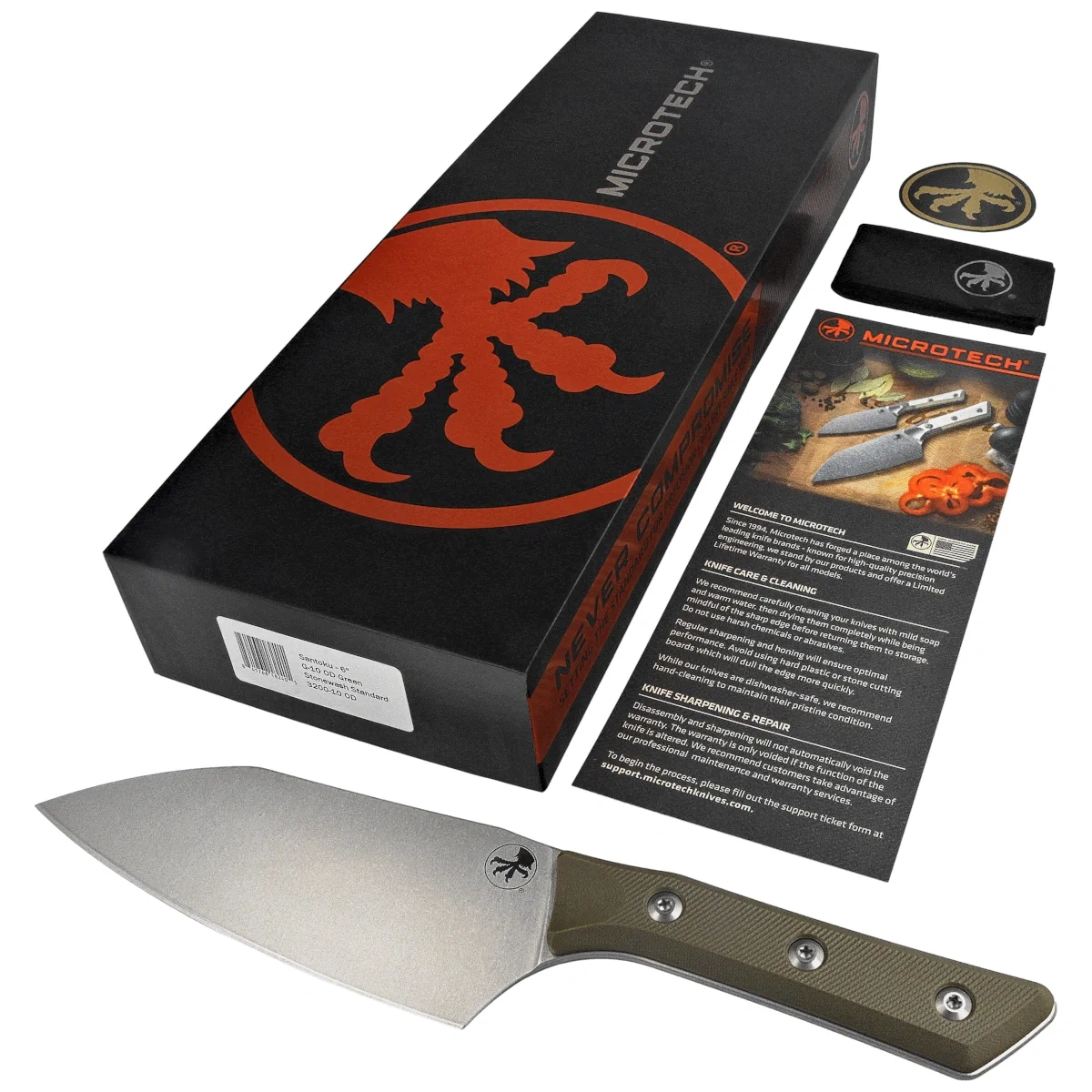 Rękojeść - z kompozytu G10 to połączenie wytrzymałości, lekkości i ergonomii, dopasowanej do potrzeb intensywnej pracy w kuchni. Jej prosty, funkcjonalny kształt oraz subtelna tekstura powierzchni zapewniają pewny chwyt w każdej sytuacji – także przy wilgotnych dłoniach lub w warunkach wysokiej wilgotności. Mocowanie na trzech śrubach torx zwiększa sztywność konstrukcji i ułatwia dostęp do wnętrza w przypadku konieczności czyszczenia. Wyprofilowany grzbiet rękojeści pozwala na naturalne prowadzenie dłoni, minimalizując zmęczenie i zwiększając kontrolę nad ostrzem. Rękojeść łączy nowoczesny design z użytkową surowością, charakterystyczną dla projektów Microtech.