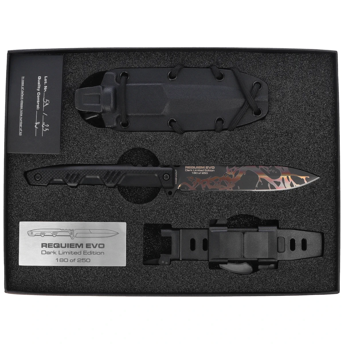 - Requiem Evo Dark LE No 180/250 Black G10, Burnishing – limitowany do 250 egzemplarzy nóż taktyczny z głownią typu spear point ze stali CPM MagnaCut. Konstrukcja full tang, rękojeść z czarnego G10 i dwie pochwy, taktyczna z ASPIS i EDC z Kydexu.