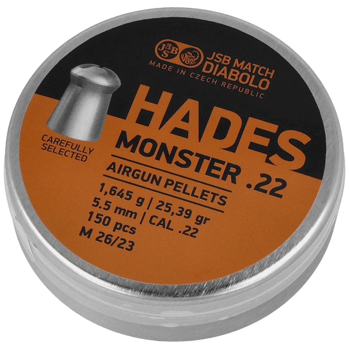 Hades Monster .22 nowy kształt dla jeszcze lepszej celności! Zgodnie z nazwą, jest to najcięższy śrut Hades w ofercie firmy JSB, nadkalibrowa amunicja w kalibrze 4.50 mm. Ręcznie sortowany, precyzyjny ciężki śrut o dużej penetracji i wysokiej deformacji. Amunicja myśliwska o dużej sile rażenia: dzięki specjalnie wyprofilowanej głowicy przednia część pocisku łatwo się odkształca i przekazuje trafionemu celowi maksymalną ilość energii kinetycznej. Wzorowany na JSB Exact King. Opakowanie 150 szt.