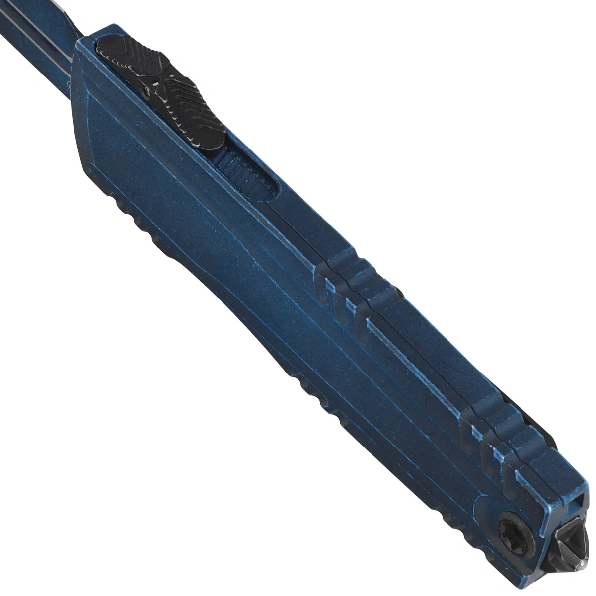 Rękojeść - wykonana z doskonałą precyzją w technologii 3D na frezarkach CNC, z wykończonego metodą metodą Weathered Blue aluminium 6061-T6. Na rękojeści głęboko grawerowane logo Microtecha, szpon drapieżnego ptaka. Faktura powierzchni rękojeści powoduje, że nóż nie ślizga się w dłoni podczas używania. Na grzbiecie i dole rękojeści znajdują się nacięcia (jimping) dla pewniejszego chwytu. Innowatorska, bezśrubowa konstrukcja rękojeści. Smukły profil oraz frezowany dwupozycyjny (prawa/lewa) masywny, tytanowy klips typu deep carry, umożliwiają dyskretne przenoszenie noża w kieszeni, w pozycji tip-down (czubkiem ostrza do dołu). Wyposażony w gładką kulkę rollerball, dzięki której nóż z łatwością wsuwa się do kieszeni nie niszcząc brzegów kieszeni. Rękojeść zakończono nową wersją zbijaka do szyb, stalowa piramida, w którą wprasowano kulkę z węglika wolframu. Z tyłu rękojeści otwór do przeplecenia linki ozdobnej.