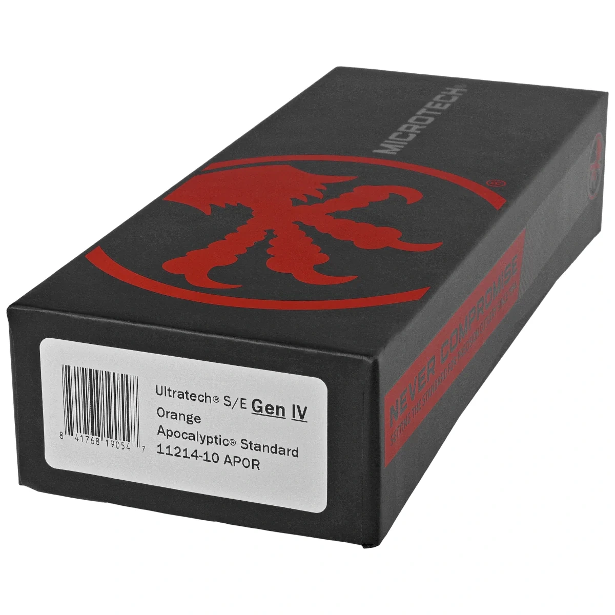 Ultratech Gen IV S/E Orange Aluminium, Apocalyptic to pełnowymiarowy nóż automatyczny OTF (Out The Front) z serii Ultratech. Czwarta generacja wyróżnia się szeregiem usprawnień, takich jak; Crud Kutter™, Dual-Fuel Drive Train™. Przeprojektowano również rękojeść, wyposażając ją w rozwiązania znane z innych modeli. Pracujący w trybie D/A (Double Action), umożliwia błyskawiczne wysunięcie i schowanie ostrza za pomocą jednego ruchu kciuka. Projekt autorstwa Tony’ego Marfione, właściciela Microtech Knives, łączy w sobie nowoczesny design z najwyższą jakością wykonania.