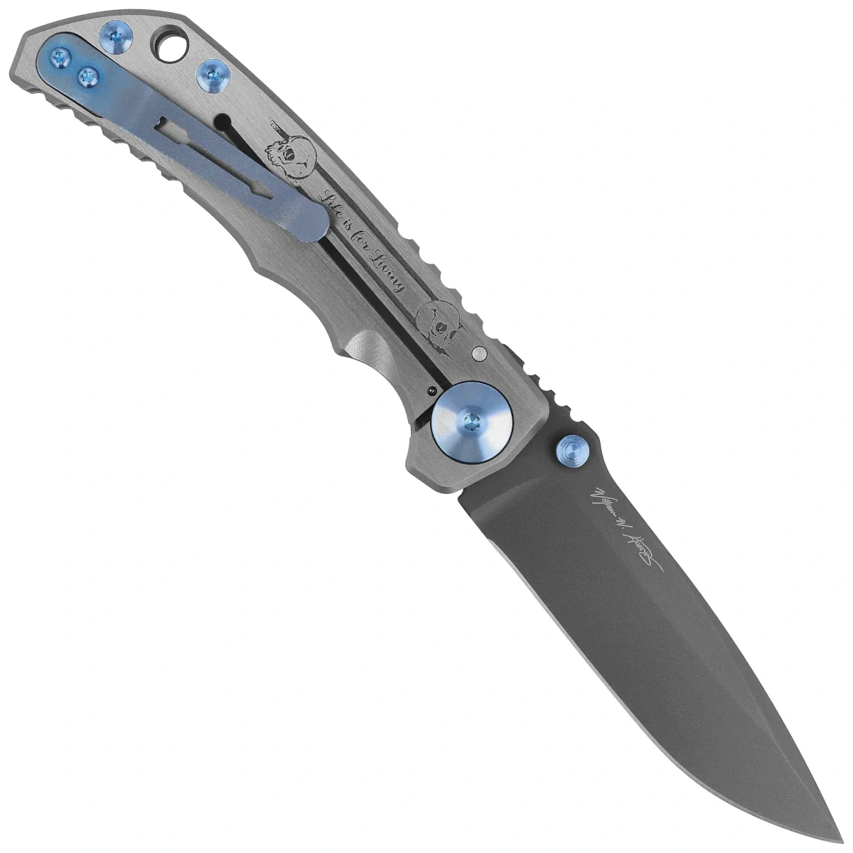 Solidna rękojeść z tytanu ozdobiona jest artystycznym grawerunkiem "Memento Mori". Dzięki odpowiednio wyprofilowanemu uchwytowi nóż pewnie leży w dłoni, zapewniając precyzję podczas wykonywania różnorodnych działań. Solidny mechanizm blokujący typu frame lock gwarantuje bezpieczne użytkowanie nawet w ekstremalnych warunkach. Każdy egzemplarz jest wykonywany ręcznie w USA, co czyni go wartościowym i poszukiwanym przedmiotem zarówno wśród kolekcjonerów, jak i wymagających użytkowników.