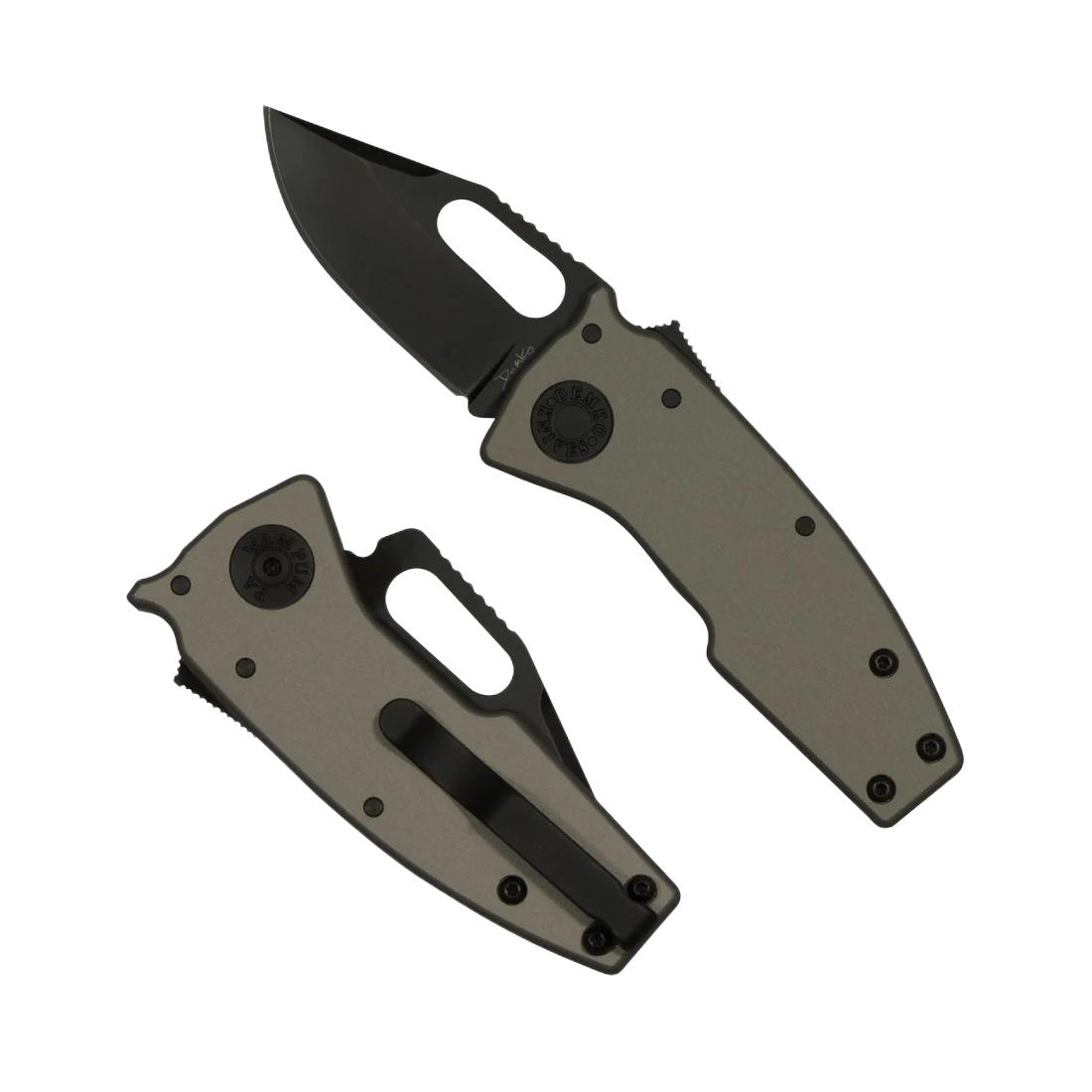 Rękojeść - okładziny z aluminium, wyróżniające się lekkością, sztywnością i odpornością na warunki zewnętrzne. Wyczuwalna tekstura i profilowane podcięcia wspierają pewny chwyt, także w rękawicach. Dwupozycyjny (prawa/lewa) klips umożliwia przenoszenie noża w pozycji tip-up, czubkiem ostrza ku górze. Shark-Lock™, umieszczony w górnej części rękojeści, działa błyskawicznie, zapewniając pełną kontrolę i bezpieczeństwo, niezależnie od preferowanego chwytu czy dominującej ręki.