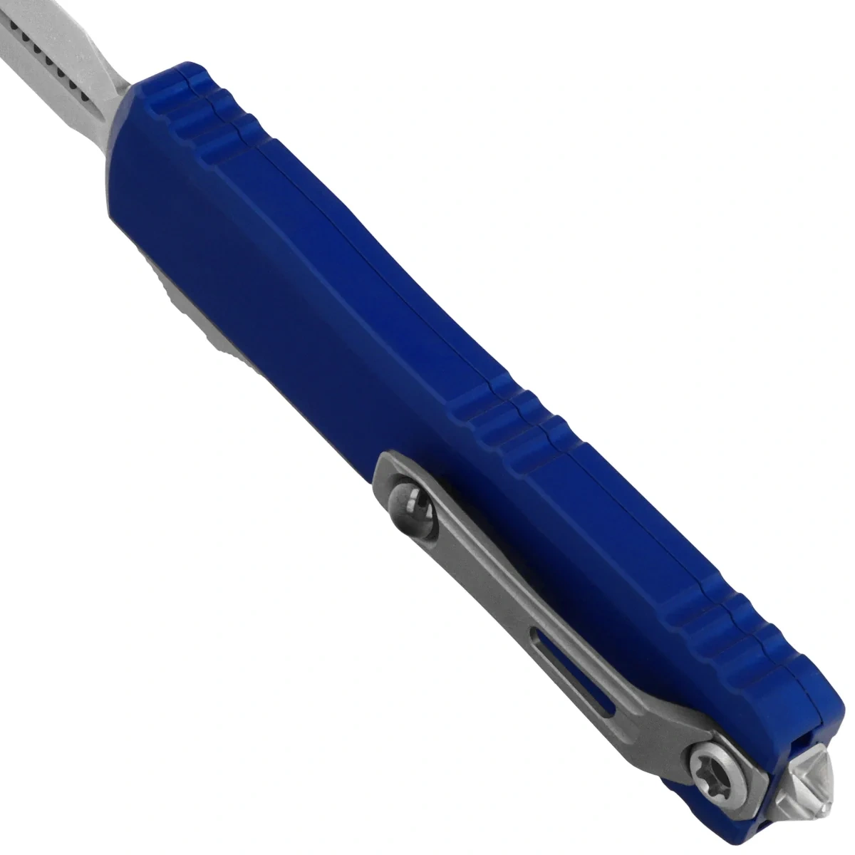 Ultratech Gen IV D/E Navy Blue Aluminium, Stonewashed to pełnowymiarowy nóż automatyczny OTF (Out The Front) z serii Ultratech. Czwarta generacja wyróżnia się szeregiem usprawnień, takich jak; Crud Kutter™, Dual-Fuel Drive Train™. Przeprojektowano również rękojeść, wyposażając ją w rozwiązania znane z innych modeli. Pracujący w trybie D/A (Double Action), umożliwia błyskawiczne wysunięcie i schowanie ostrza za pomocą jednego ruchu kciuka. Projekt autorstwa Tony’ego Marfione, właściciela Microtech Knives, łączy w sobie nowoczesny design z najwyższą jakością wykonania.