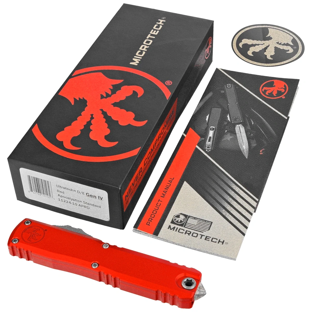 Ultratech Gen IV D/E Red Aluminium, Apocalyptic to pełnowymiarowy nóż automatyczny OTF (Out The Front) z serii Ultratech. Czwarta generacja wyróżnia się szeregiem usprawnień, takich jak; Crud Kutter™, Dual-Fuel Drive Train™. Przeprojektowano również rękojeść, wyposażając ją w rozwiązania znane z innych modeli. Pracujący w trybie D/A (Double Action), umożliwia błyskawiczne wysunięcie i schowanie ostrza za pomocą jednego ruchu kciuka. Projekt autorstwa Tony’ego Marfione, właściciela Microtech Knives, łączy w sobie nowoczesny design z najwyższą jakością wykonania.