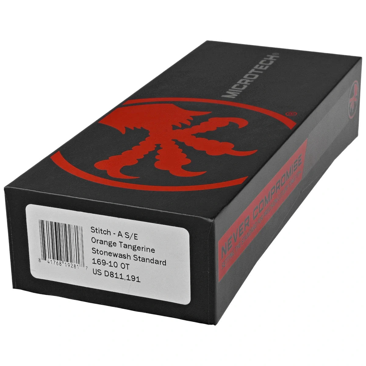 Stitch-A S/E Orange Tangerine Tri-Grip Aluminium, Stonewashed automatyczna wersja śmiałego projektu wszechstronnego noża taktycznego, efekt współpracy Sebastijana Berenji i firmy Microtech. Szeroka głownia i prosta, wygodna w każdym chwycie rękojeść dają mocny nóż taktyczny wykonany z dbałością o najdrobniejsze szczegóły i z najlepszych materiałów. Wierny towarzysz, który nigdy nie zawiedzie