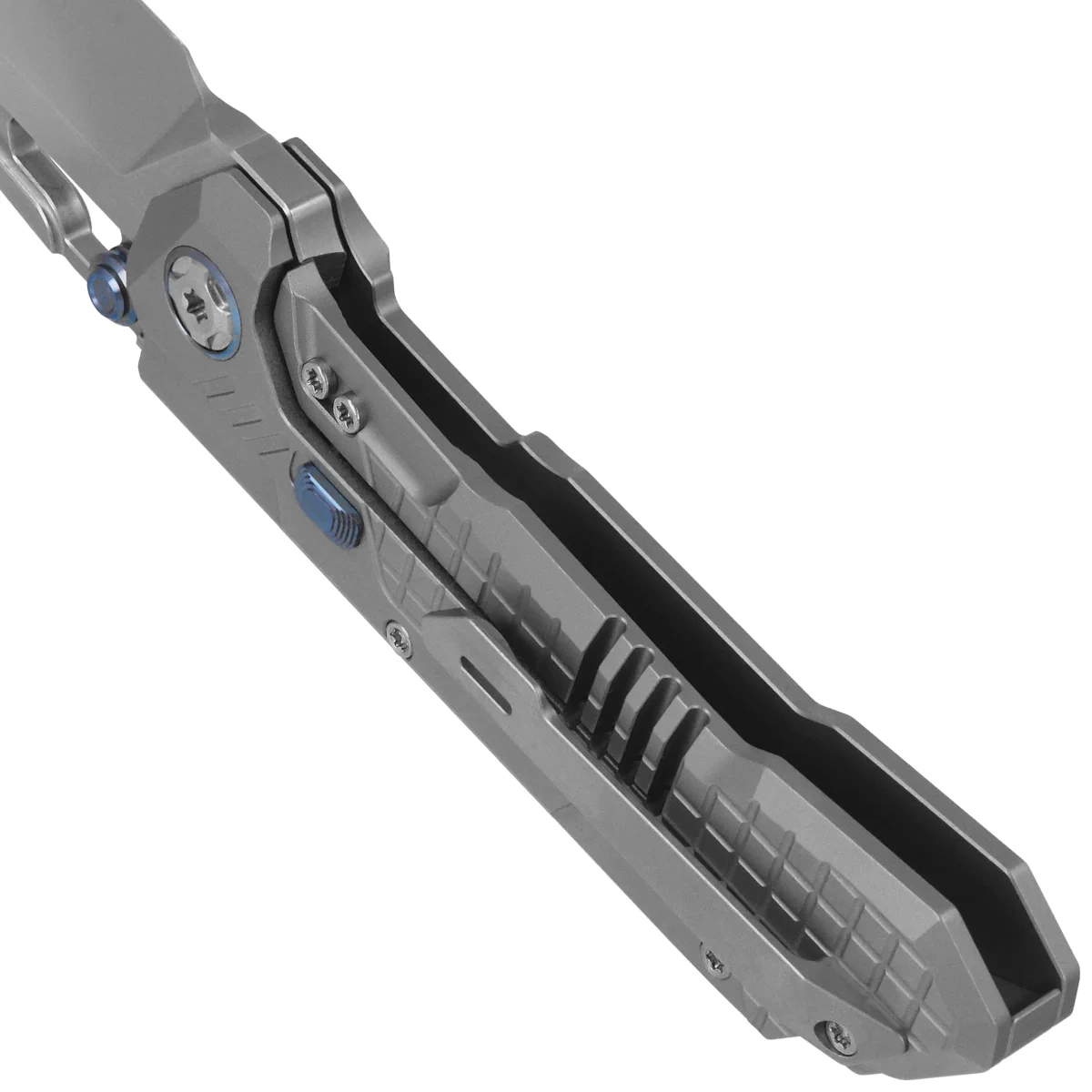 Rękojeść - wykonana z tytanu, integralny element konstrukcji noża, odpowiadający za jego sztywność, trwałość oraz pewność chwytu. Wyraźnie zaznaczone krawędzie, frezowane płaszczyzny i regularna tekstura powierzchni poprawiają kontakt dłoni z rękojeścią oraz ograniczają poślizg, nawet przy dynamicznych ruchach i długotrwałym użytkowaniu. Profil uchwytu sprzyja naturalnemu ułożeniu dłoni, zapewniając stabilność zarówno przy pracy precyzyjnej, jak i przy cięciach wymagających większego nacisku. Konstrukcja zachowuje spójny balans pomiędzy masą a kontrolą, co pozytywnie wpływa na manewrowość noża w codziennym użytkowaniu. Zastosowany klips z tytanu umożliwia wygodne, dyskretne przenoszenie i nie zakłóca ergonomii chwytu. Całość tworzy rękojeść o jednoznacznie technicznym charakterze, zaprojektowaną z myślą o trwałości, niezawodności i komforcie długotrwałej pracy.