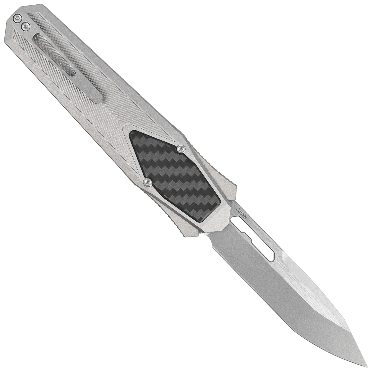 Rękojeść - wykonana na frezarkach CNC z aluminium, z trójwymiarową teksturą. Fazowane krawędzie okładek eliminują ostre ranty, a perfekcyjnie dopasowana wkładka (inlay) z kompozytu Carbon Fiber nadają ekskluzywnego charakteru oraz poprawiają pewność uchwytu. Po prawej stronie kunsztowny suwak do wysuwania/wsuwania klingi. Jednopozycyjny tytanowy (prawa) klips deep carry umożliwia dyskretne przenoszenie noża w kieszeni w pozycji tip-down (czubkiem ostrza do dołu).